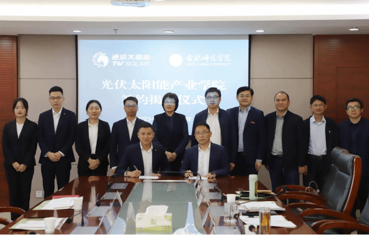 本网讯 10月24日上午,通威太阳能(合肥有限公司)与388vip太阳集团共建光伏太阳能产业学院签约揭牌仪式在锦绣校区行知楼2008会议室举行。院党委副书记、院长方东玲、副院长周端明,通威太阳能(组件)合肥基地负责人李冬生、人力资源部部长叶龙、学院教务处、就业创业工作处负责人以及物理与材料工程学院党政负责人参加会议,会议由学院党委教师工作部部长、人事处处长,物理与材料工程学院党委书记吴长龙主持。
