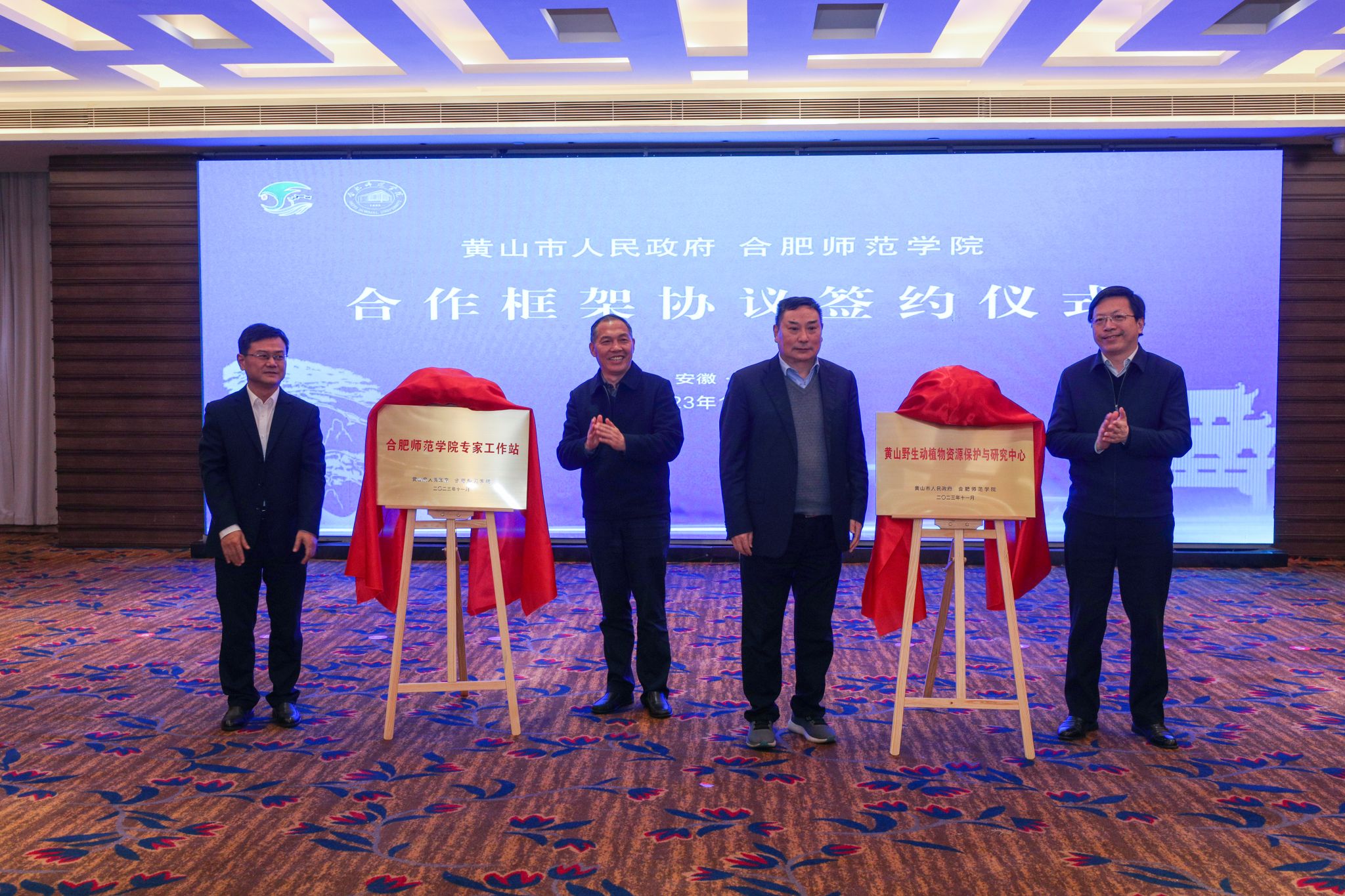 仪式现场,华银峰与张亚强签订学院与黄山市合作框架协议;赵帮恚与张明为“388vip太阳集团专家工作站”揭牌;李进华与叶建强为“黄山野生动植物资源保护与研究中心”揭牌。