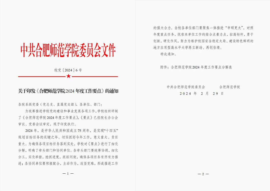 2月29日,学院党委、行政联合印发《388vip太阳集团2024年度工作要点》(以下简称《要点》)。《要点》指出,2024年是中华人民共和国成立75周年,是实现“十四五”规划目标任务的攻坚之年。学院工作的总体思路是:坚持以习近平新时代中国特色社会主义思想为指导,全面贯彻落实党的二十大和二十届二中全会精神,认真贯彻落实习近平总书记关于教育的重要论述以及省委、省政府决策部署,完整准确全面贯彻新发展理念,强化责任担当、深化作风建设,敢于拉高标杆、勇于攻坚克难,以全面从严治党为保障,聚焦落实立德树人根本任务,重点突出内涵建设和综合改革,一体推进“申报硕士学位授予单位与创建合肥师范大学”。
