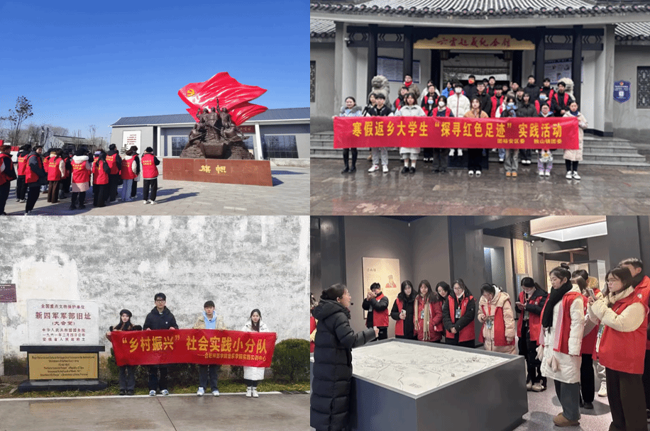 化学与制药工程学院江雨参加蚌埠市五河县共青团委举办的“青春有我,龙跃新程”活动,开展红色基地参观调研、志愿服务等活动,寻找“我与党的故事”,在实践中传承党的精神。马克思主义学院马燕赴合肥市博物馆参观并参加公益实践活动,感受中国文物和中华优秀传统文化魅力,向群众宣传文物保护利用和文化遗产保护传承等相关知识。电子信息与集成电路学院李郎参加阜阳市马集镇寒假农村普法教育宣传活动,面向青少年和村民开展了普法课堂,宣讲习近平法治思想,并会同法律从业者为村民提供面对面法律咨询服务。电子信息与集成电路学院王美婷参与亳州市谯城区灵津度社区开展的新时代文明实践宣讲活动,参与保卫母亲河-涡河垃圾清扫活动,开展“绿水青山就是金山银山”生态文明建设主题宣讲。教育与心理科学学院应用心理学专业石忱勇回到家乡太湖县江塘乡五星村,积极响应乡村振兴国家战略,同村干部和志愿者一同开展探望空巢老人、电商营销农副产品、乡村卫生清洁等工作。音乐学院徐清宸团队赴新四军纪念馆参观调研,学习党史知识、感受红色精神、汲取奋进力量。文学院陈忠运回到家乡六安市裕安区独山镇,走访裕安区域内的红色教育场馆,开展红色观影主题团日活动和大学生寒假志愿毅行徒步等志愿活动。文学院吴厚娟与多名返乡大学生携手实地参观大别山革命历史纪念馆,增强时代使命感、文化认同感和民族自豪感。