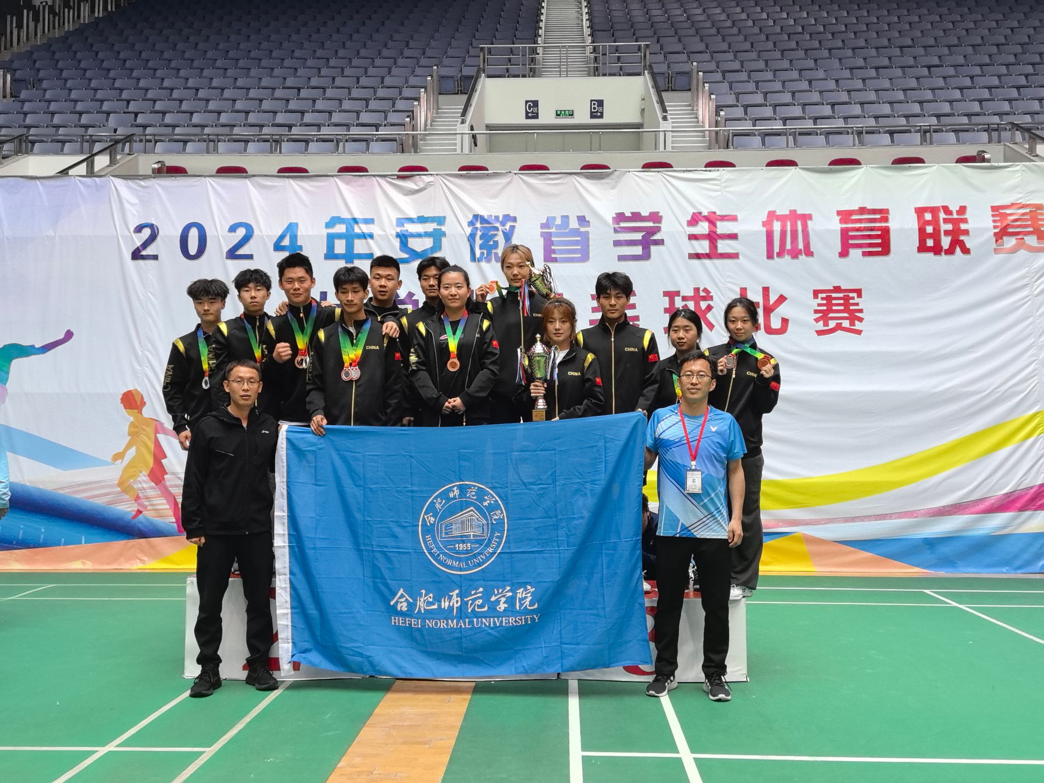 4月23日-4月30日,由安徽省教育厅、安徽省体育局联合主办的2024年安徽省学生体育联赛大学生羽毛球比赛在安徽大学磬苑校区举行,来自安徽省内39所本科高校、37所高职高专院校的近900名运动员参加比赛。我校羽毛球队团结协作、顽强拼搏,斩获丙组男子团体亚军、女子团体季军、男子单打亚军、混合双打亚军、男子双打亚军和女子单打季军的优异成绩,并荣获“体育道德风尚奖集体”称号。