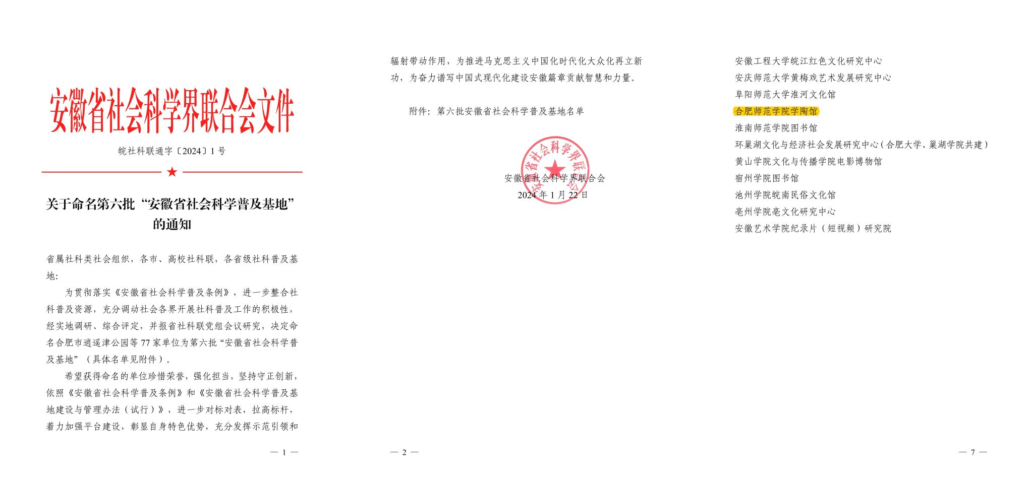 近日,安徽省社会科学界联合会发布《关于命名第六批“安徽省社会科学普及基地”的通知》,我院学陶馆名列其中。
