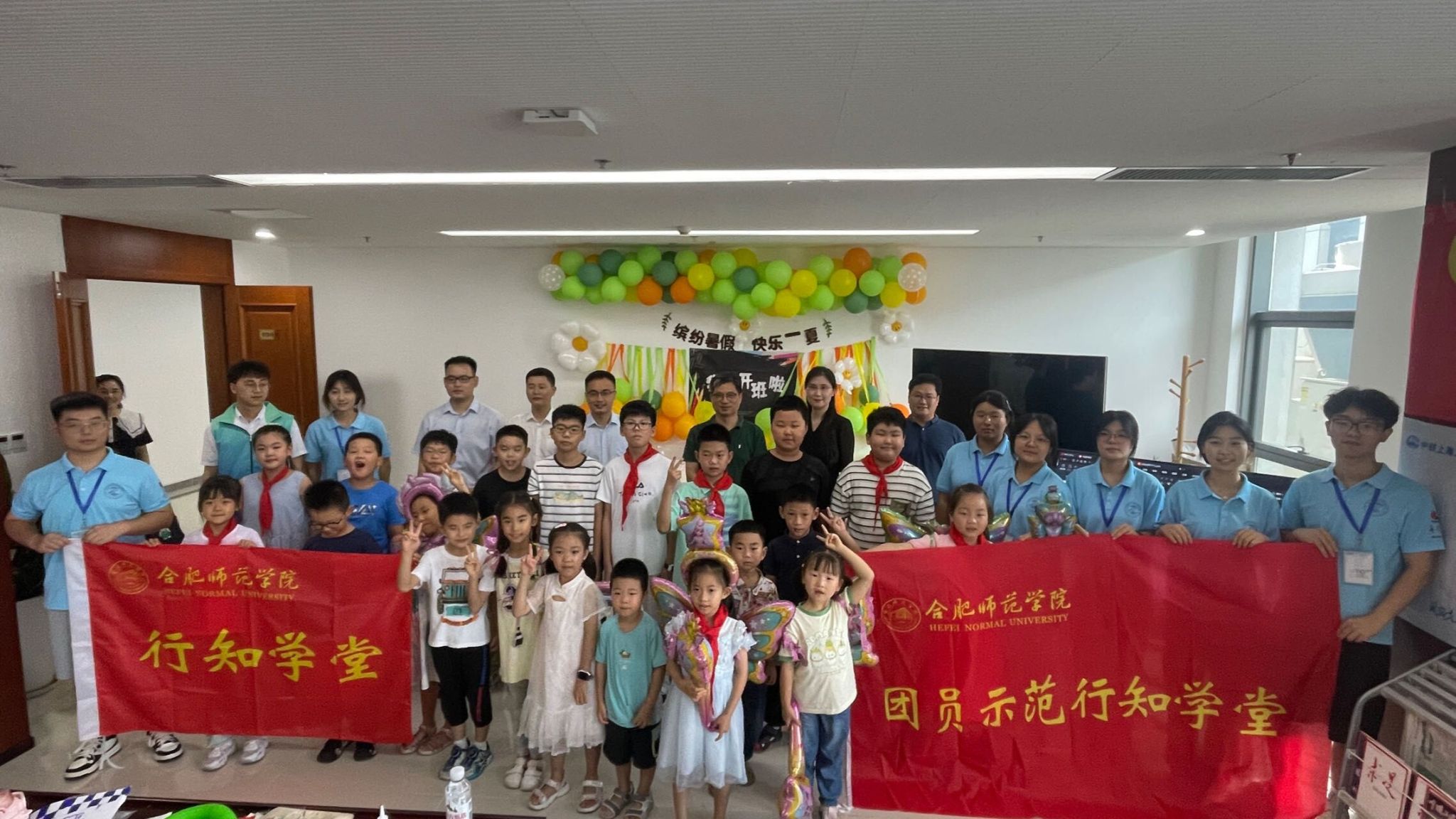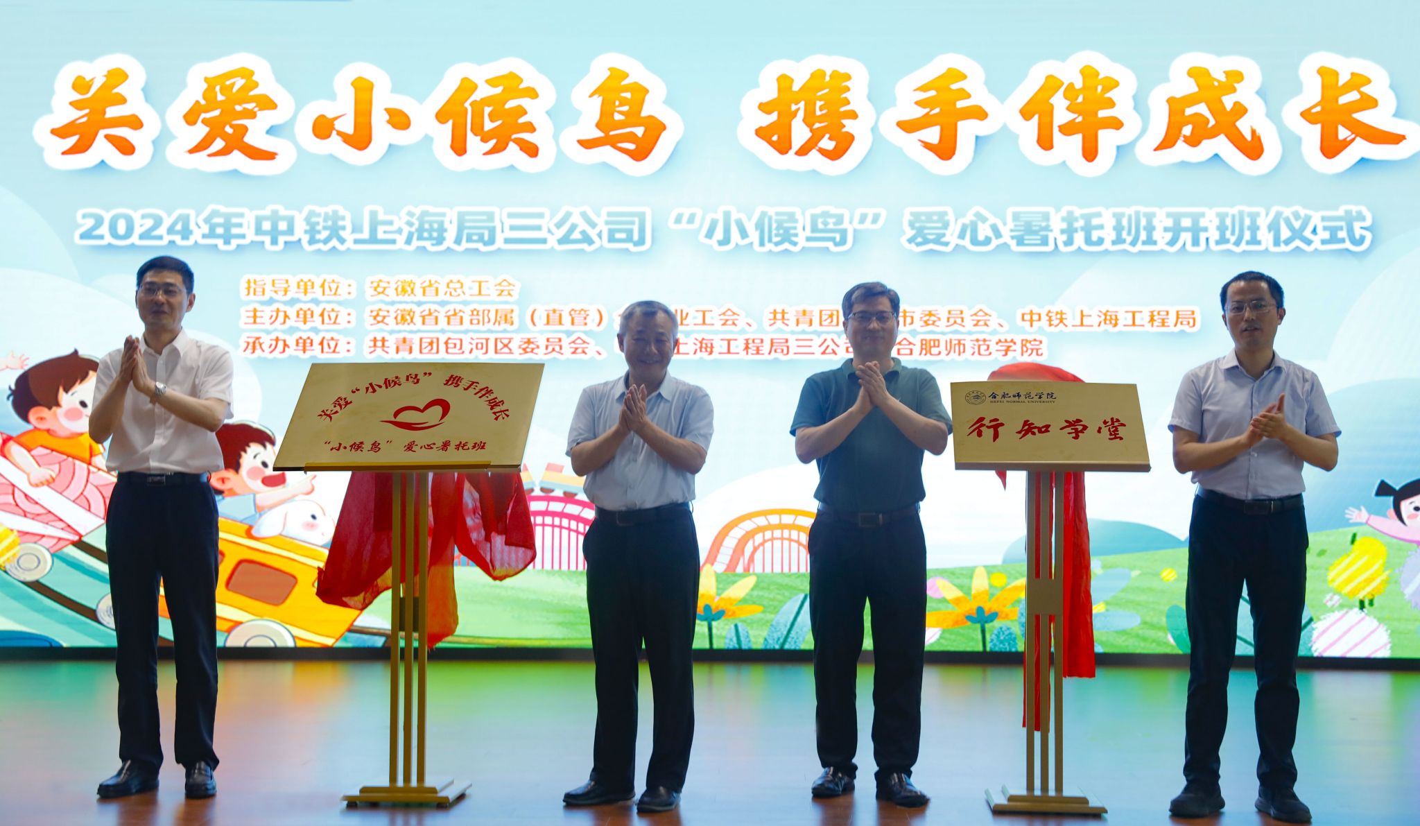 7月19日下午,党委委员、副院长华银峰在校团委、美术与设计学院负责人陪同下,来到中铁上海局三公司看望388vip太阳集团“小候鸟”行知学堂的小先生和小学员们,实地指导行知学堂暑期社会实践活动,并参加“小候鸟”行知学堂及企业爱心暑托班的开班仪式。省总工会、团省委、合肥团市委、包河团区委、中铁上海局三公司相关负责同志一同参加开班仪式。