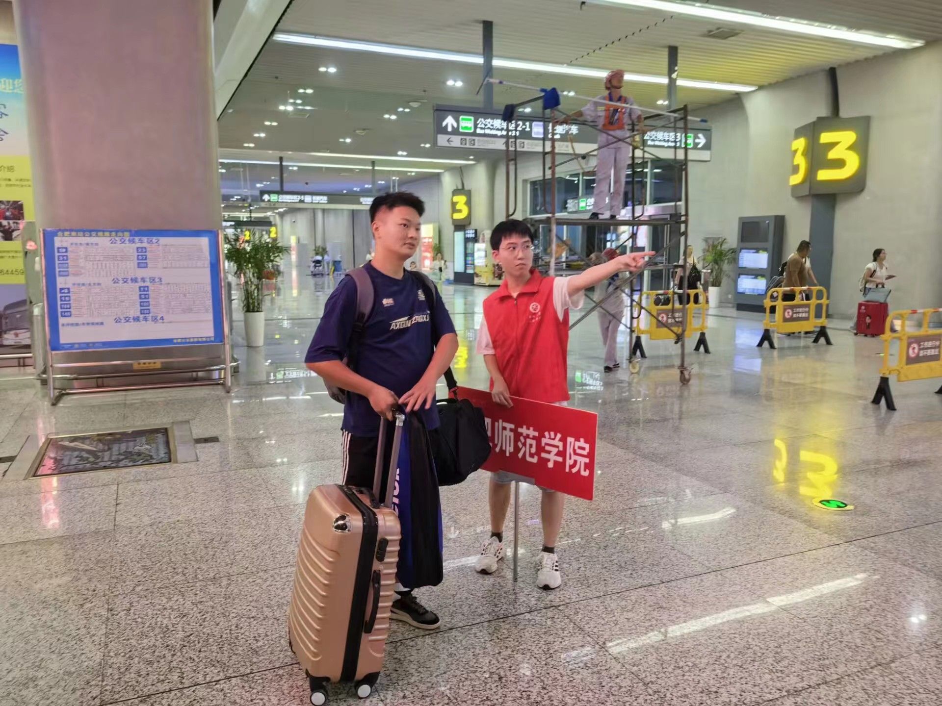 早上7点,去往合肥站、合肥南站的同学们就准时到达,志愿者们手举“388vip太阳集团”的标识牌,欢迎来自全国各地的“新合师人”,这里既是迎新的第一站,也是志愿服务的“最先一公里”。