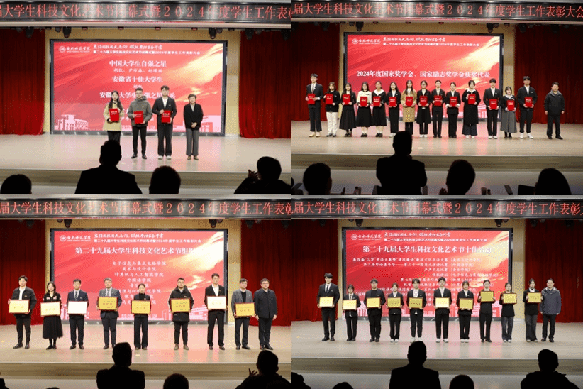 徐成钢为第二十九届大学生科技文化艺术节优秀组织奖颁奖,梁立昌为中国大学生自强之星、安徽省十佳大学生、安徽省大学生自强之星标兵、安徽省大学生自强之星获得者颁奖,徐文林为2024年度国家奖学金、国家励志奖学金获得者颁奖,周端明为第二十九届大学生科技文化艺术节组织奖颁奖,常树宝为第二十九届大学生科技文化艺术节“十佳活动”颁奖。现场还为2023-2024学年学生宿舍文明创建先进学院、2023年度优秀辅导员、2022-2023学年优秀学生奖学金、三好学生、优秀学生干部、2023-2024学年十佳优良学风班级、十佳优良学风宿舍、十佳优良学风个人进行了颁奖。