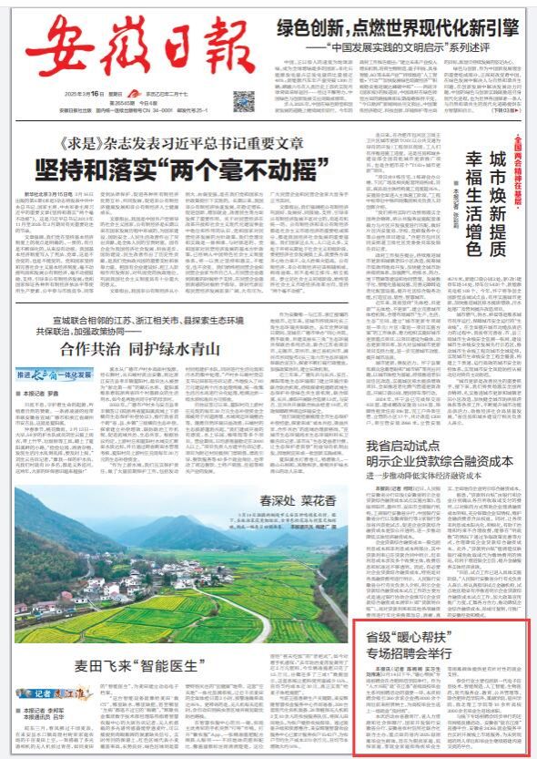 近日,新华社客户端、安徽新闻联播专题报道了“暖心帮扶”专场招聘会,《安徽日报》头版、《安徽日报》客户端、视频号等平台集中报道了“暖心帮扶”专场招聘会。《安徽青年报》、安青网等多家主流媒体纷纷报道。