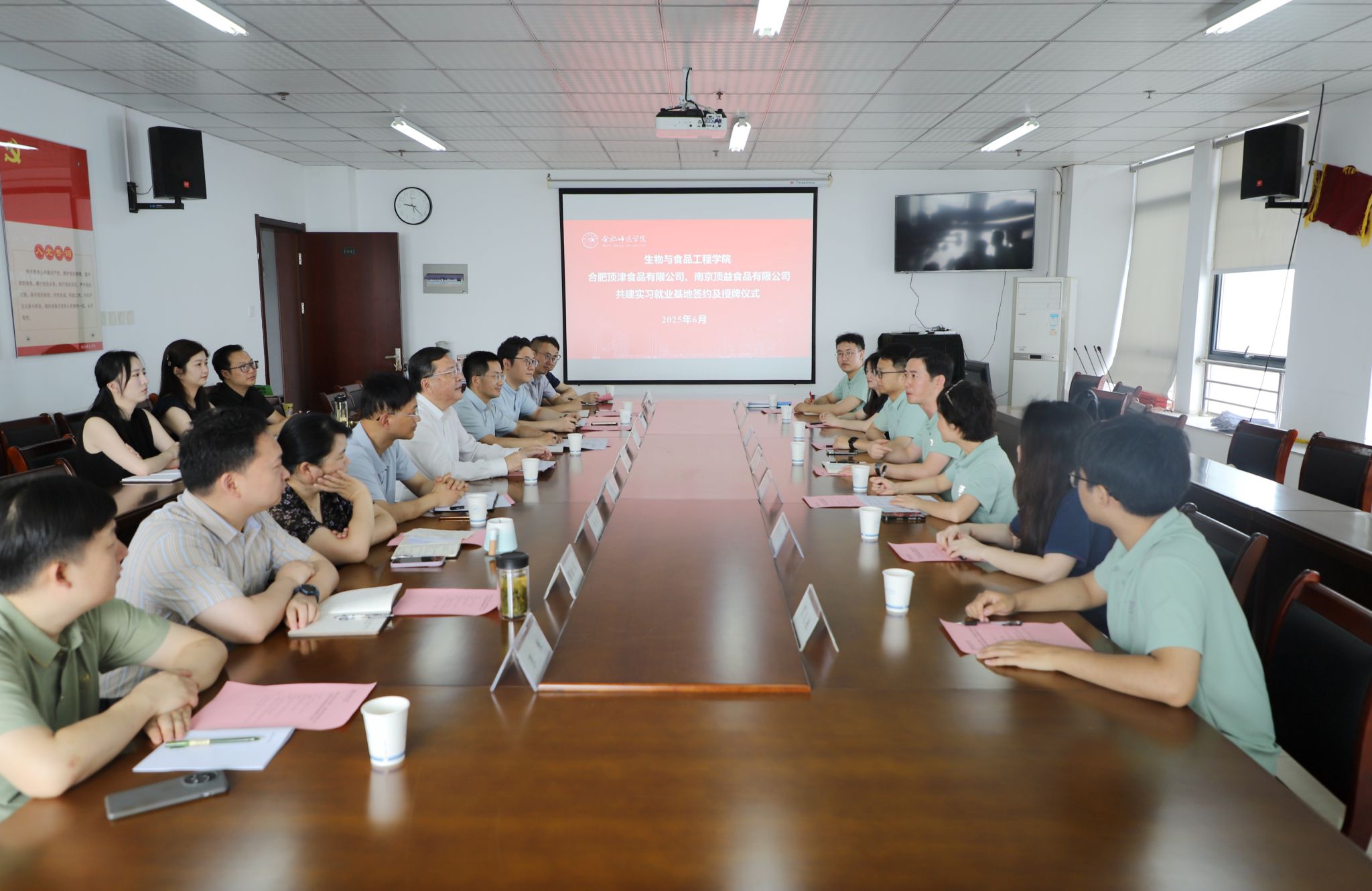 为深化产教融合,推动校企协同发展,6月13日,学院与康师傅(合肥、南京事业部)在锦绣校区行知楼1502室举行产学研合作签约仪式。康师傅合肥顶津食品有限公司厂长张建峰、康师傅南京顶益食品有限公司人资处处长陈莹莹等来校交流。院党委书记徐成钢,党政办公室、就业创业工作处负责人,生物与食品工程学院党政班子成员参加活动。会议由生物与食品工程学院党委书记主持。
