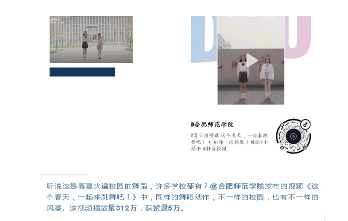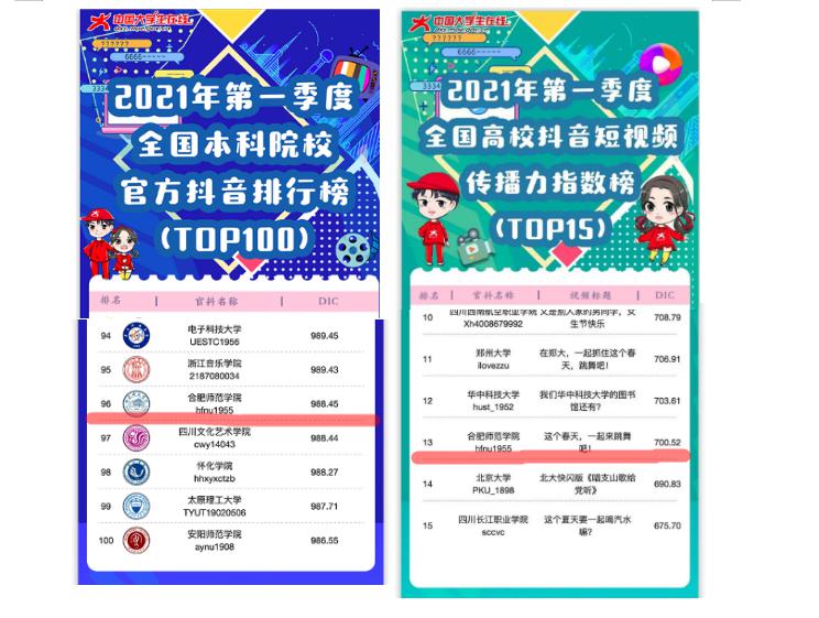 本网讯 近日,教育部主办的中国大学生在线网站发布了2021年第一季度全国高校抖音综合影响力排行榜和全国高校抖音短视频传播力指数榜。我院官方抖音号以影响力指数(DIC) 988.45,位于全国高校排名第96位、安徽省排名第2位。今年3月,学院官方抖音号发布的原创视频作品《这个春天,一起来跳舞吧!》以312万播放量,5万获赞量跻身2021年第一季度全国高校抖音短视频传播力指数榜第13位,这也是安徽省唯一上榜的高校原创视频作品。