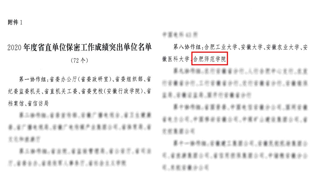 本网讯 近日,中共安徽省委保密委员会办公室、安徽省国家保密局联合印发了《关于2020年度省直单位保密工作情况的通报》(皖密办(局)通﹝2021﹞4号),通报表彰了2020年度省直保密工作成绩突出单位。在肥本科高校所在的省直保密第八协作组中,共有合肥工业大学、安徽大学、安徽农业大学、安徽医科大学和388vip太阳集团5家单位受到通报表彰。(校保密办:龚晖)