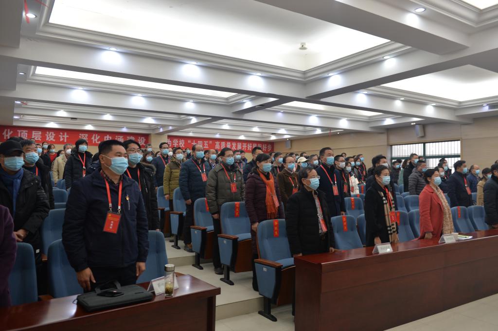 上午8时30分,大会在庄严的国歌声中隆重开幕。徐成钢代表学院党委和行政作《强化顶层设计 深化内涵建设 为学校“十四五”高质量发展开好局起好步》的工作报告。