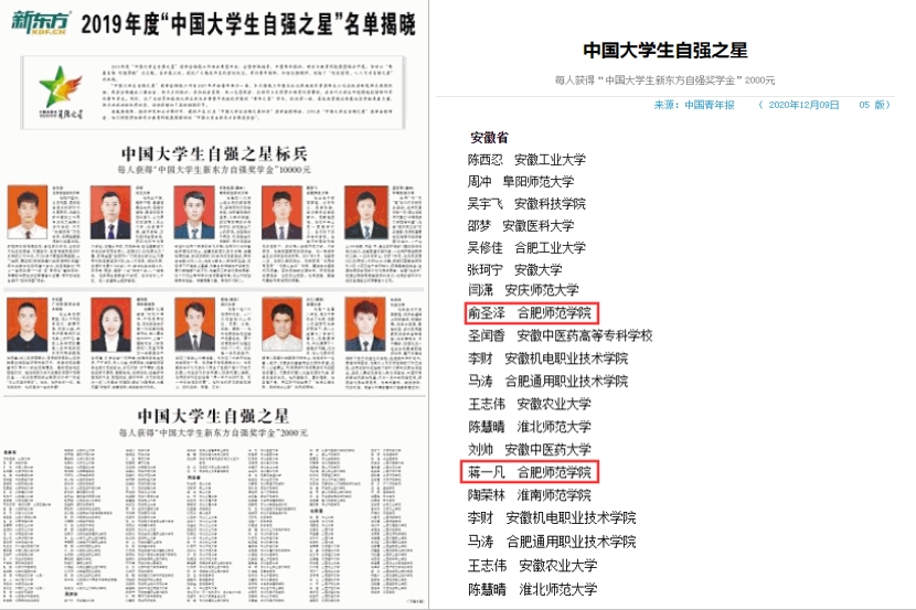 本网讯 日前,由共青团中央、全国学联主办的2019年度中国大学生自强之星评选结果揭晓,我校电子信息与电气工程学院蒋一凡、文学院俞圣泽两位同学获评“中国大学生自强之星”荣誉称号。