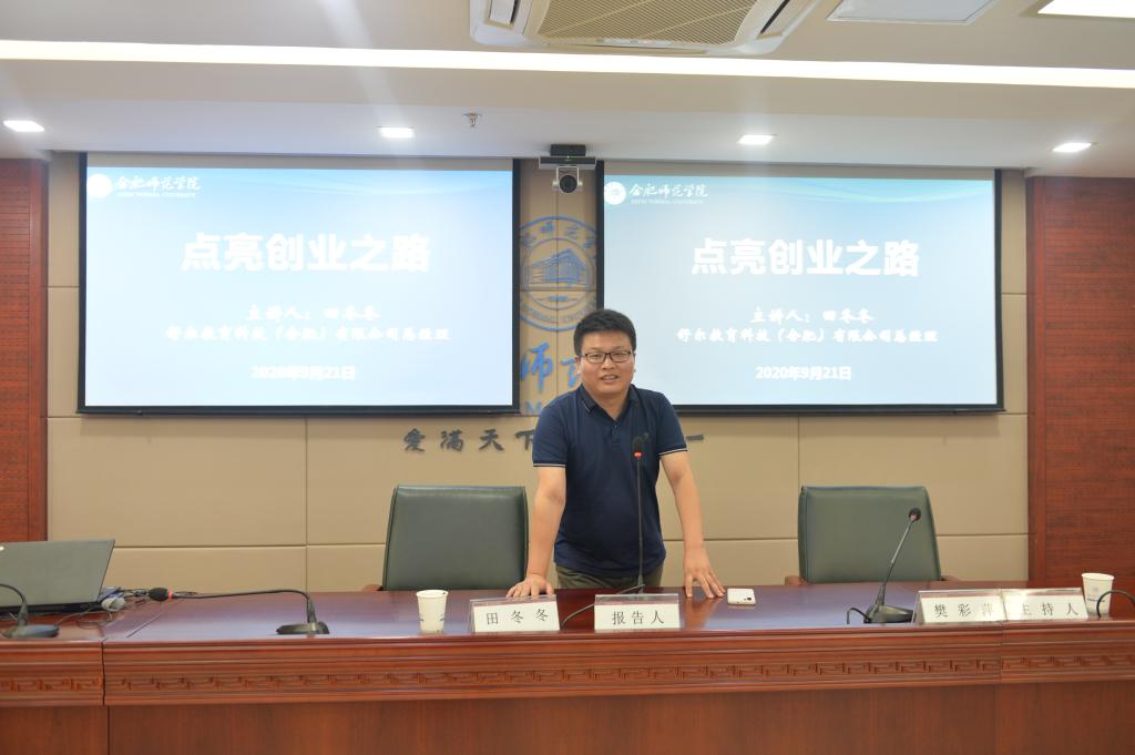 本网讯 9月21日下午,我院2013届化学专业校友、舒尔教育科技(合肥)有限公司总经理田冬冬应邀回到母校,在行知楼2011会议室作了题为“点亮创业之路”的讲座。化学与化学工程学院、外国语学院、文学院、艺术与传媒学院的本科生代表和部分教育硕士聆听了讲座。讲座由发展规划处(校友办)副处长樊彩萍主持。