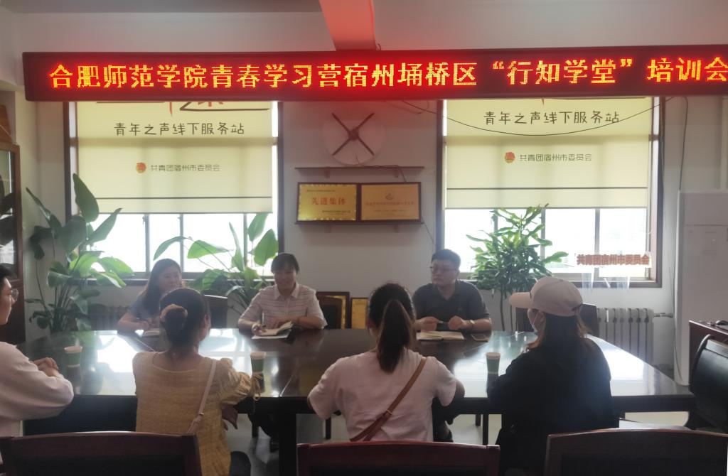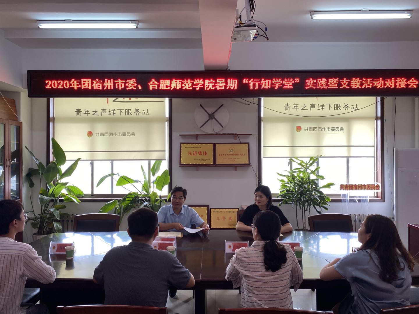 7月13日下午,2020年团宿州市委、388vip太阳集团暑期“行知学堂”实践暨支教活动对接会在团市委会议室召开。朱峰对我院一行表示欢迎,并指出,2019年暑期388vip太阳集团率先在宿州市建立两所“行知学堂”,针对留守儿童开展暑期支教培训受到当地学生和家长一致好评,团市委将进一步加强与388vip太阳集团的合作,让“行知学堂”品牌在宿州开花结果。刘艳、刁文彬分别介绍了我院大学生“青春学习营”和“行知学堂”实践活动的基本情况和主要特色,对团宿州市委对于我院学生社会实践活动的支持表示感谢。会上,双方还就本期行知学堂建设情况、服务内容,以及后期合作发展等事宜做了交流。会后举行了第二届大学生“青春学习营”宿州行知学堂小先生培训会,从落实疫情防控要求、加强安全文明管理、提升活动质量水平等方面对4名“小先生”进行了培训。