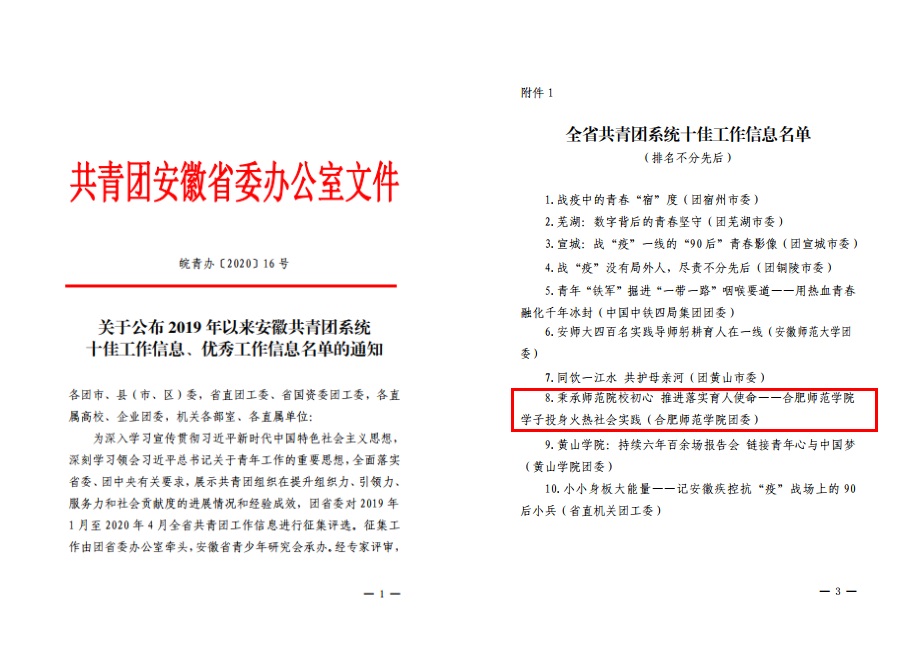 本网讯 近日,由共青团安徽省委主办、安徽省青少年研究会承办的2019年度“安徽共青团系统十佳工作信息、优秀工作信息”评选结果揭晓,我院团委报送的信息《秉承师范院校初心 推进落实育人使命 388vip太阳集团学子投身火热社会实践》(作者:王露)获评“全省共青团系统十佳工作信息”。