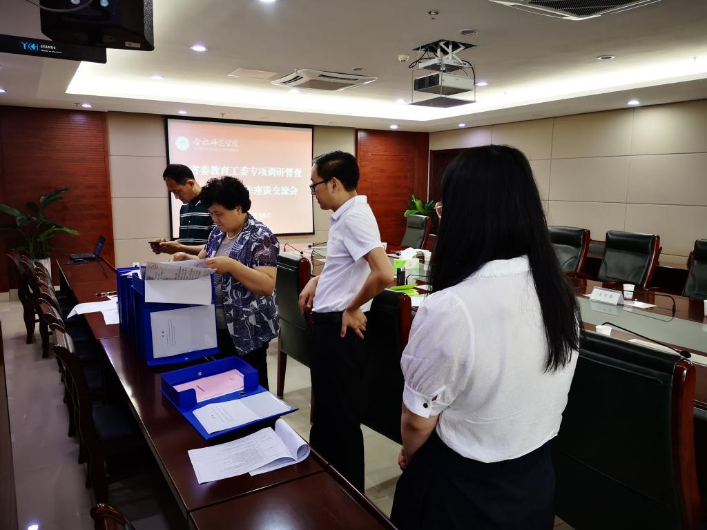 本次调研督查主要采取实地走访、听取汇报、查阅台账、座谈交流等方式进行。座谈会前,调研组一行深入校园,走访了艺术传媒学院,了解“三全育人”工作进展情况,观看了学生“课程思政”案例展示—“艺绘长征路、奋进新时代”主题创作展,并与学院和专业负责人就“课程思政”推进情况进行了交流。调研组一行还实地查看了学陶馆、校史馆以及校园宣传橱窗、展架、横幅、电子屏等校园思想文化阵地,调研了“行知学堂”学生社会实践活动开展情况等。(宣传部)