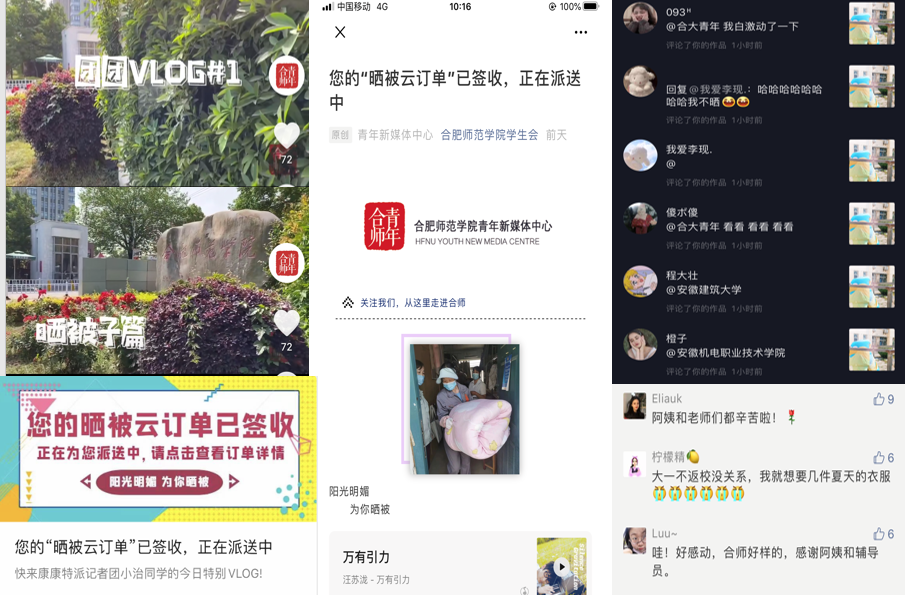 本次服务以VLOG的形式,依托“合师青年”官方抖音号、“合师青年”官方微信号、“388vip太阳集团学生会”官方微信号开展报道,受到同学们的好评点赞和社会人士的广泛关注。“终于当了一回‘别人家的学校,很是开心’”抖音用户@颜卓66表示。“母校在我们毕业这么多年后,还是那么的贴心温暖!”校友用户@白菜叶 有感而发。“是时候向他们学习了!安排!”兄弟院校的同学们也纷纷通过评论区加入到互动中来。