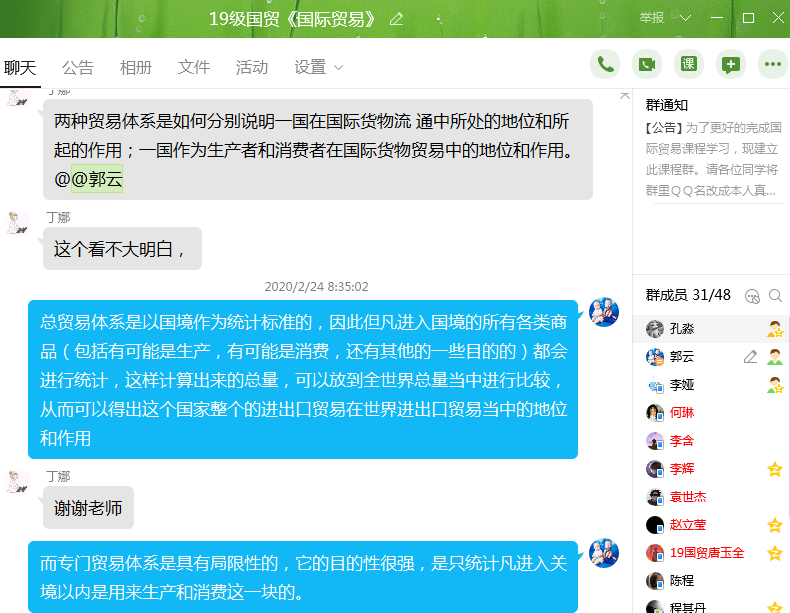 为认真贯彻教育部和省教育厅关于做好疫情防控期间教学工作的部署要求,确保“停课不停教、停课不停学”,根据学校和学院的线上教学指导意见,我承担了新学期19级国际经济与贸易专业学生《国际贸易》课程的线上教学任务。本着线上教学期间“站好岗,授好课,教好学生”的原则,在《国际贸易》课程线上教学的前期准备、线上授课和课后总结各环节过程中,我坚持以饱满的精神、认真负责的态度投入工作,践行好教师的职责。