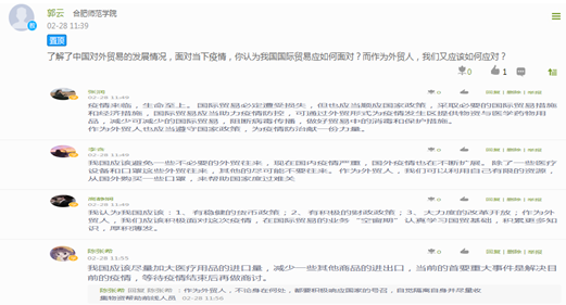 《国际贸易》课程的线上教学,是采用“直播+录播+MOOC慕课+学生自学”混合式教学模式来进行的,并采用了多元化手段来助力线上教学效果。学生每次开课前,我会将此次课程内容提前放在平台以便学生“预习”。开课时,会以平台“通知”的方式告知学生此堂课的学习任务,以便学生明确学习目标。同时,通过“学习通”签到打卡,以掌握学生的到课情况。开课中,会以直播点名提问、录播教学视频中随机设立讨论题要求学生在讨论区回答及小节测试等手段,来掌控学生的学习状态。课后,会以要求学生定期完成平台作业的形式,来及时了解学生知识掌握的薄弱点,以便下节课有针对性的加强学习。