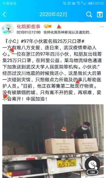本网讯 2020年新春伊始,突如其来的新型冠状病毒,让本该温情洋溢的春节异乎寻常。疫情牵动了每一位国人的心,在共同战“疫”的号召下,无数口罩被送往疫区,无数医护人员奔向湖北武汉,无数志愿者自愿守护一方净土。此时,化学与化学工程学院的青年们选择了在寒冬中尽己所能,增一点光,发一份热。