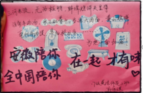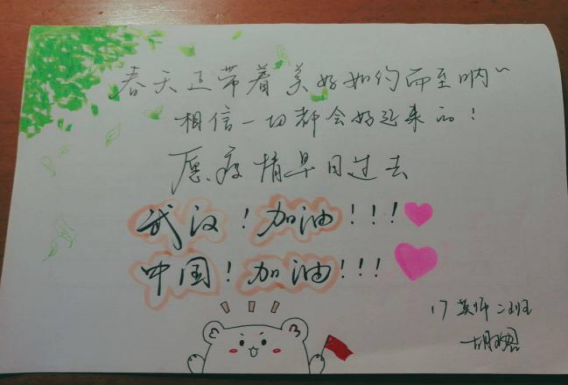 2017级英语(师范)1、2班,线上通过开展视频录制、书法作品、制作祝福卡等网络活动,为武汉加油,用更加理性和客观的态度对待当前发生的一切,从自身做起、从身边做起提高防疫意识,从而展现疫情面前青年学子的担当与行动。