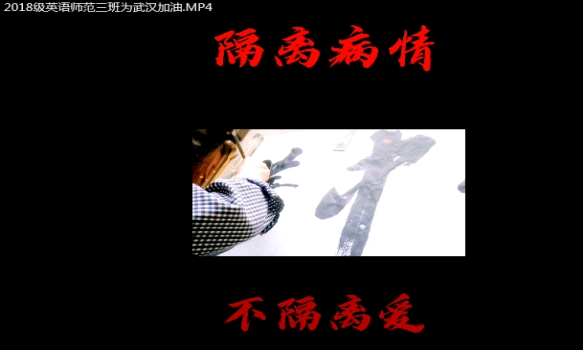 2017级英语(师范)3班、2018级英语(师范)1班,通过与家人以歌唱的形式、抗击疫情应援祝福等视频发送至抖音,微博等互联网平台上,用行动积极抗击疫情,为逆行的勇士们祈福,为奋战在一线的“战士”们送去最真诚的祝福。为中国加油,为武汉加油!
