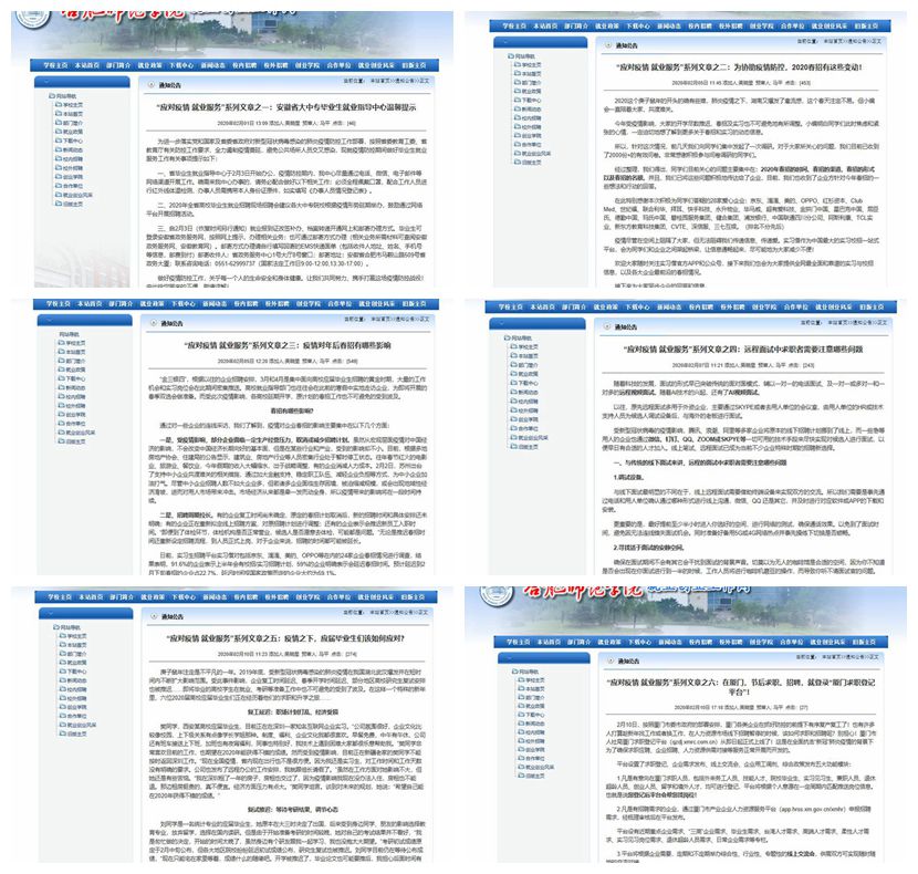 学院疫情防控工作部署之后,就业创业工作处在就业创业工作网开辟“应对疫情 就业服务”专栏,第一时间转发上级通知公告,发布形势分析和就业指导文章,通过各学院负责就业工作的辅导员转发给应届和往届毕业生,提醒每位同学严格按照学校疫情防控相关文件要求,在做好自身健康安全防范的前提下,及时了解就业形势,掌握就业政策,获取有针对性的就业指导。
