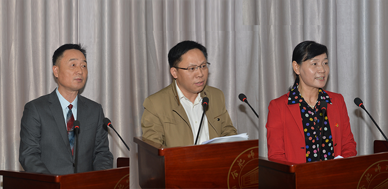 围绕本次主题教育读书班集中学习研讨会的既定主题“党章党规和全面从严治党”,外国语学院院长黄波以《遵守党章党规 全面从严治党永远在路上》为题,数学与统计学院党总支书记郑支农以《坚持以党章为根本遵循 推动全面从严治党向基层延伸》为题,党委委员、宣传部部长操申斌以《从文本视角谈学习遵守党章党规 推进全面从严治党》为题依次作了重点交流发言。