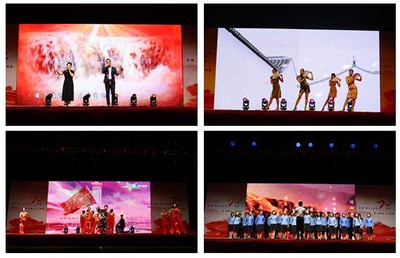 麦田乐队带来的歌曲《旅行》铿锵有力,拉开晚会序幕。独唱《我爱你中国》真情流露,唱出合师学子对祖国母亲的情深意切。舞蹈《红旗颂》热烈激昂,舞者用有优美的舞步抒发出浓郁的爱国之情。舞台剧《那些年》真情塑造了我党地下工作者“麻雀”的人物形象,演员的精湛演技和感人肺腑的剧情不禁让人潸然泪下。舞蹈《Peace&Love》在光影音效下,为观众带来一场视听盛宴。舞蹈《封印无限梦》将舞蹈、舞台剧元素与动漫相结合,收获阵阵掌声。走秀《锦瑟安年》在中国风音乐中粉墨登场,旗袍、中山装、团扇等传统服饰映入眼帘,彰显了中华传统文化的魅力。话剧《秋瑾》再现了“鉴湖女侠”秋瑾慷慨就义的场景,生动展现了革命党人坚守理想、视死如归的风范。院团委姚瑶老师和学生工作处马喆老师合作演唱的爱国歌曲《国家》琅琅上口、响彻全场,观众们纷纷挥舞起手中的小国旗,一起加入到大合唱中。大学生艺术团的合唱《保卫黄河》歌声铿锵有力,以充满力量的时代音符,让观众仿佛穿越时空,置身于全民抗战的硝烟中,见到了游击健儿端起土枪洋枪、挥动大刀长矛,在青纱帐里、万山丛中,为保卫黄河、保卫全中国而战斗的壮丽场景。
