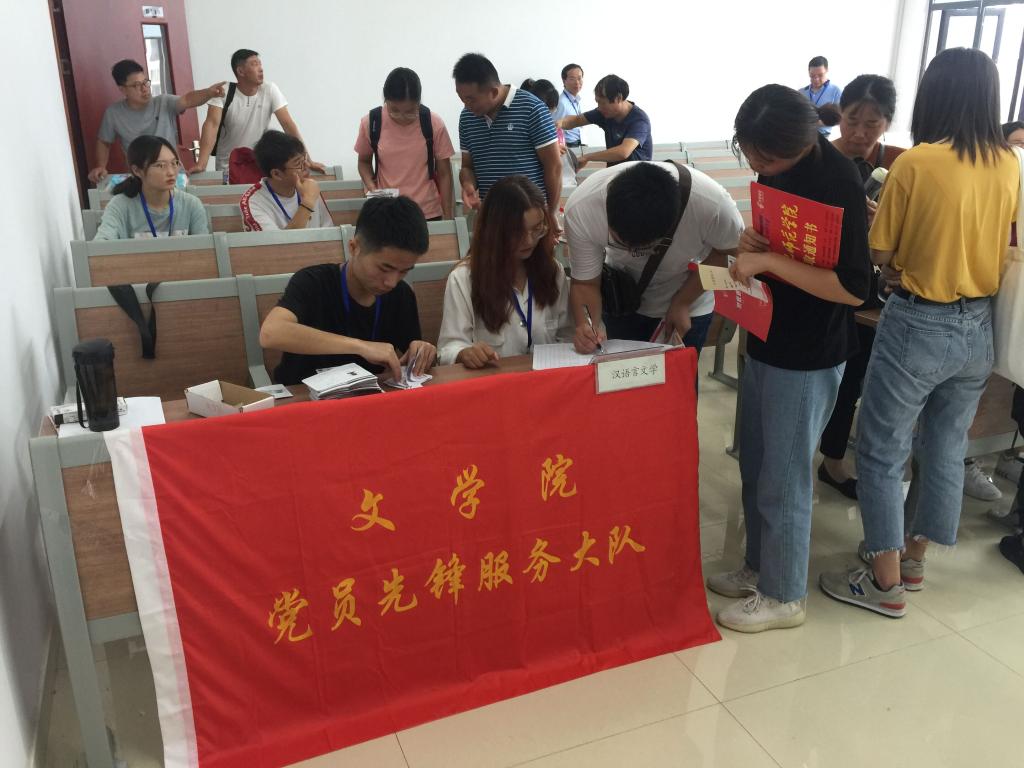 迎新当天,各学院学生党组织用亮身份、挂标牌,成立服务站、先锋队、服务队等形式,带动广大学生党员投入迎新当中,用热情、周到、贴心的服务,充分发挥先锋模范作用。文学院设立党员先锋服务台,组织开展党员“一对一”结对帮扶;经济与管理学院、数学与统计学院建立党员迎新服务站,为新生提供耐心的解答和热情的服务;教师教育学院、外国语学院、艺术传媒学院、化学与化学工程学院、生命科学学院、电子信息与电气工程学院、物理与材料工程学院、马克思主义学院均成立学生党员志愿先锋队,学生党员佩戴党员徽章和“党员迎新先锋”字样的标志,主动亮出党员身份,在迎新工作中一马当先;音乐学院、计算机学院、体育科学学院的学生党员迎新服务队,穿梭在人群中,以流动式服务,热情接待新同学和同学家长,受到新生及家长好评。