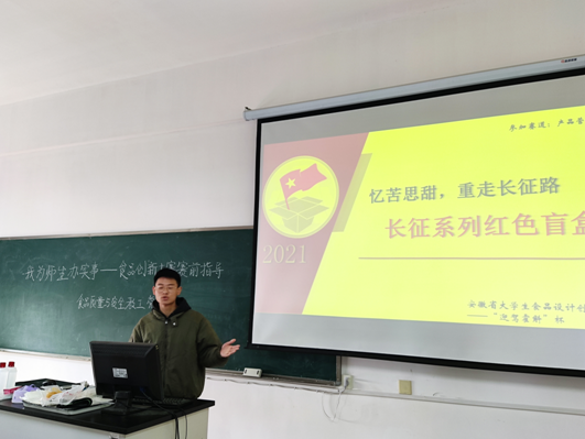 本网讯 为培育学生创新精神,提升人才培养质量,助力学生更好地备战“迎驾霍斛”杯2021年安徽省大学生食品设计创新大赛,12月8日中午,食品质量与安全教工党支部在履知楼501召开“我为师生办实事”——为我院之前校赛推出的8组作品进省赛做赛前指导。