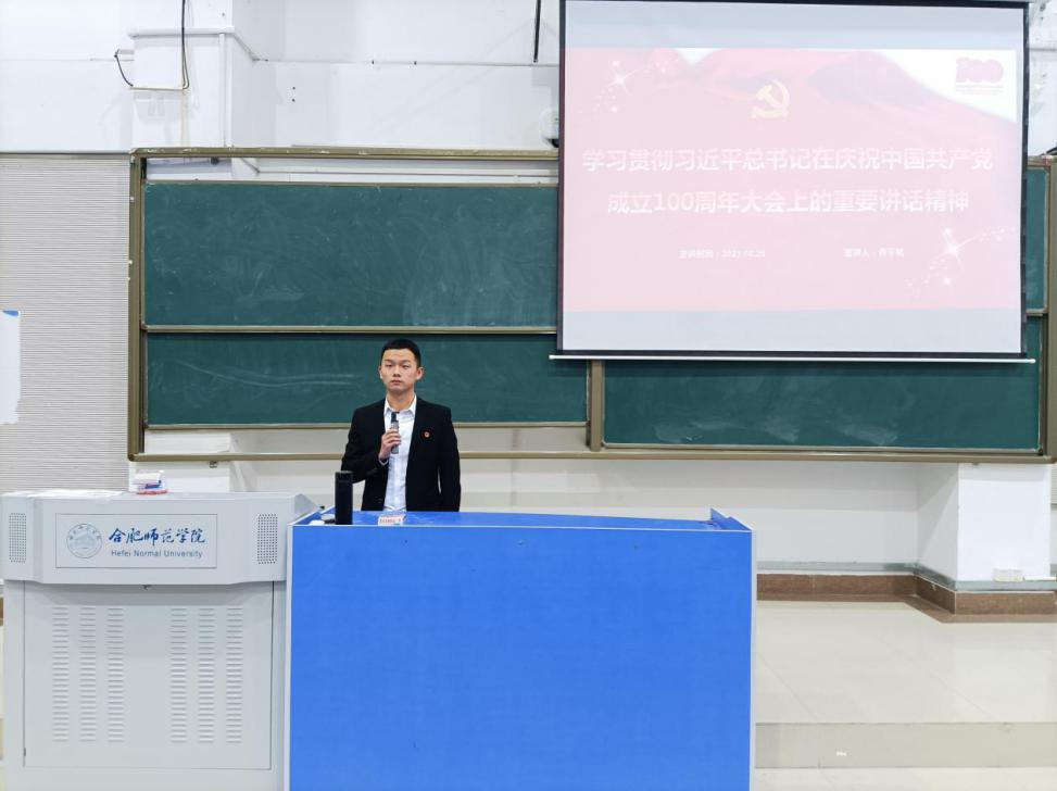 本网讯 为进一步学习贯彻习近平总书记“七一”重要讲话精神,把学生党史学习教育向纵深推进,数学与统计学院分团委于10月20日在锦绣校区逸夫楼西阶1教室开展学习贯彻习近平总书记“七一”重要讲话精神专题宣讲会,会议邀请校青年学生宣讲团成员曹宇帆同学宣讲,锦绣校区200余名学生参加了宣讲会。