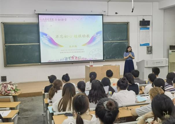 本网讯 为进一步加深教师教育学院学前教育专业的学生对办园现状的了解,把握新时代学前教育发展方向,教师教育学院与科研处于9月28日晚联合举办行知讲堂,邀请合肥市包河区教体局学前科科长、合肥市滨湖启明星幼教集团总园长张承梅受邀做“不忘初心,根植幼教”专题讲座,教师教育学院副院长闫龙、吴皖赣老师到会主持。