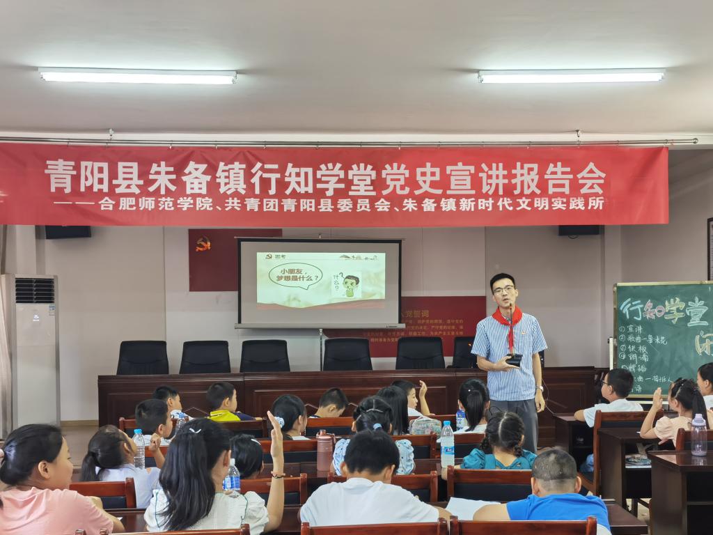 本网讯 7月30日上午,388vip太阳集团青阳县朱备镇“行知学堂”开展党史宣讲会。388vip太阳集团刘铭传学院团委书记宗彪主持会议。省青年宣讲团成员、池州市石台县矶滩乡人民政府党政办副主任胡正阳作宣讲报告。团青阳县委书记产静,388vip太阳集团团委挂职副书记、艺术传媒学院团委书记戴玉佩出席会议,参与“行知学堂”活动的60余名留守儿童聆听报告。