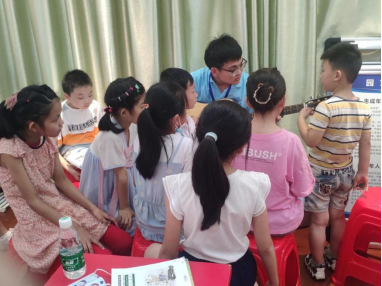 除此之外,园艺场社区行知学堂也注重调动小学员们的参与性和互动性,除了开展各类丰富多彩的趣味游戏外,“小先生”们也会用吉他伴奏教小学员唱歌,并与小学员们一起合唱,大家纷纷围坐在小先生身旁,认真学习,现场气氛轻松活跃。