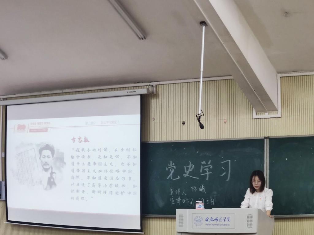 宣讲最后,两位宣讲团同学就党史学习教育对同学们发出了倡议。作为新时代合师青年,学习党史就要做到学史明理、学史增信、学史崇德、学史力行。要强化理论武装,坚定理想信念;要坚持博学笃志,厚植爱国情怀;要学会启智成行,践行初心使命,真正做到学党史、强信念、跟党走,做新时代奋发有为的青年大学生。(文学院:吴宇豪 陈曦)
