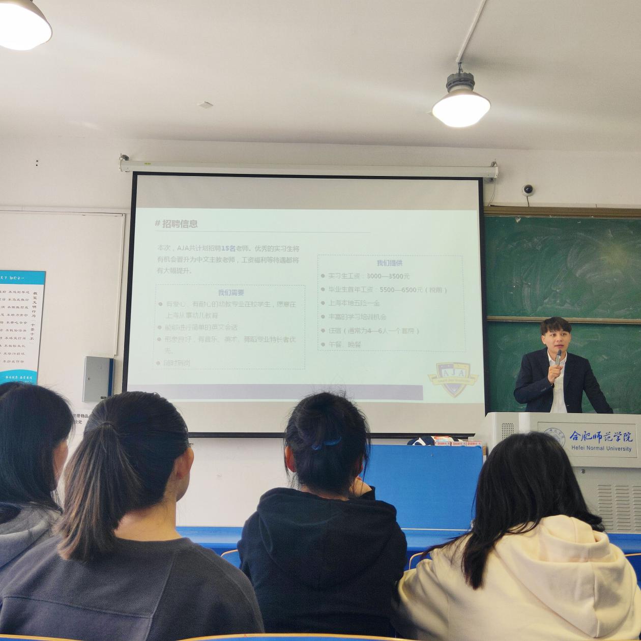 本网讯 为提升学生就业面试技能,使2021届毕业生更加全面地了解企业招聘信息,拓宽就业渠道,提供给毕业生更多的就业及未来的发展机会,教育教育学院于4月16日在锦绣校区逸夫楼A307教室举办了宝贝德全脑教育中心、Angel Joy Academy双语幼儿园、合肥市滨湖晨星幼儿园等单位的专场招聘宣讲会。宣讲会由辅导员董丹丹、屠家宝主持,部分2021届毕业生参加。