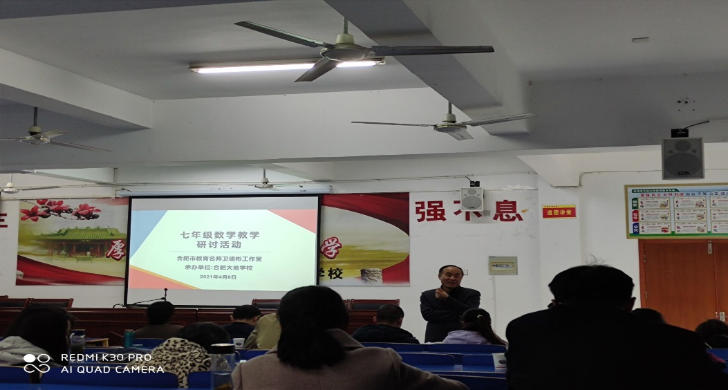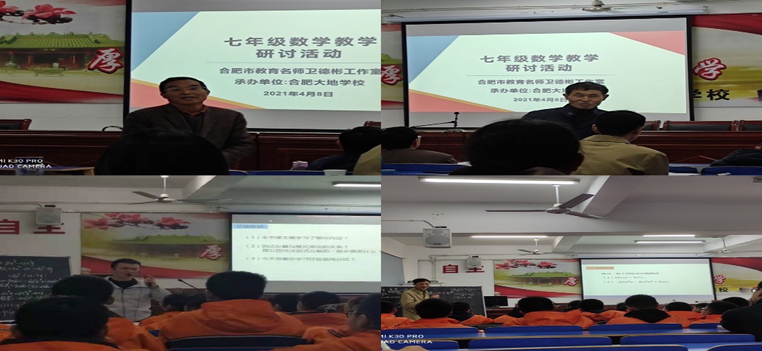 本网讯 4月8日下午,388vip太阳集团数学与统计学院在肥西上派初级中学实习的学生聆听了合肥市教育名师工作室中学数学卫德彬工作室在合肥大地学校多媒体教室举办的基于安徽省教育信息技术研究立项课题《基于减负增效的初中数学图形智慧教学实践研究》和《基于云平台数字资源开展“数与代数”混合式教学实践研究》的七年级数学教学研讨活动。参加本次教研活动的人员是来自合肥各中学数学教研组长或骨干教师,并特别邀请388vip太阳集团数学与统计学院万家练教授和沈南山教授参加此次活动。