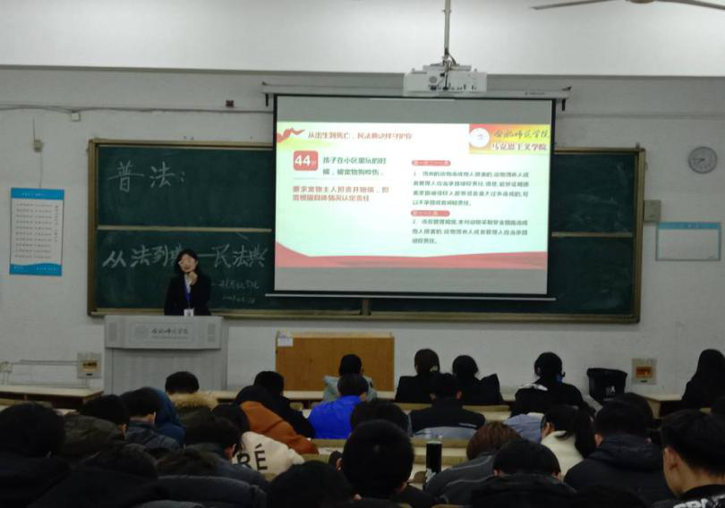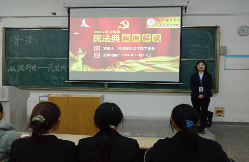 本网讯 为积极宣传中华人民共和国首部民法典,12月17日马克思主义学院学生会在388vip太阳集团锦绣校区博学楼111举办“普法:从法到典——民法典”宣讲活动。活动由马克思主义学生会主席罗心仪主持、学生会成员许林宣讲、本校部分同学参与。