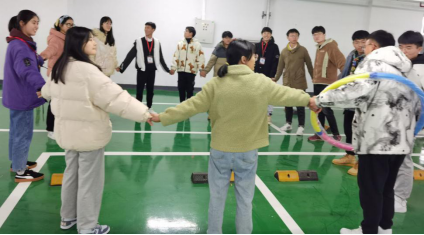 活动伊始,陈梦莹讲解此次素质拓展的目的,为帮助同学彼此了解,促进同学间交流与熟悉,体会同学间的坦诚与信任,帮助同学快速融入集体,先后进行了“手拉手竞技”、“转呼啦圈”、“设计队徽”等寓教于乐的游戏环节。在同学的欢笑声中,素质拓展活动接近尾声,同学间的彼此配合,团结合作,圆满完成团队任务。
