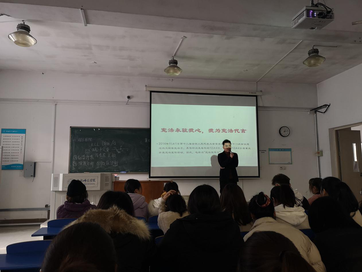 今年的12月4日是我国第七个国家宪法日,同时也迎来第三个“宪法宣传周”。活动伊始,杨帆首先带领同学们学习了中央全面依法治国工作会议精神,向同学们普及了关于宪法的一些基本知识,增强同学们对宪法的认识,学会如何利用法律法规来维护自身的权益,认识到学法、懂法、守法的重要性。接着,带领全体同学观看视频——《宪法的力量》,使他们更直观的了解宪法的发展历程,明确宪法的重要地位。