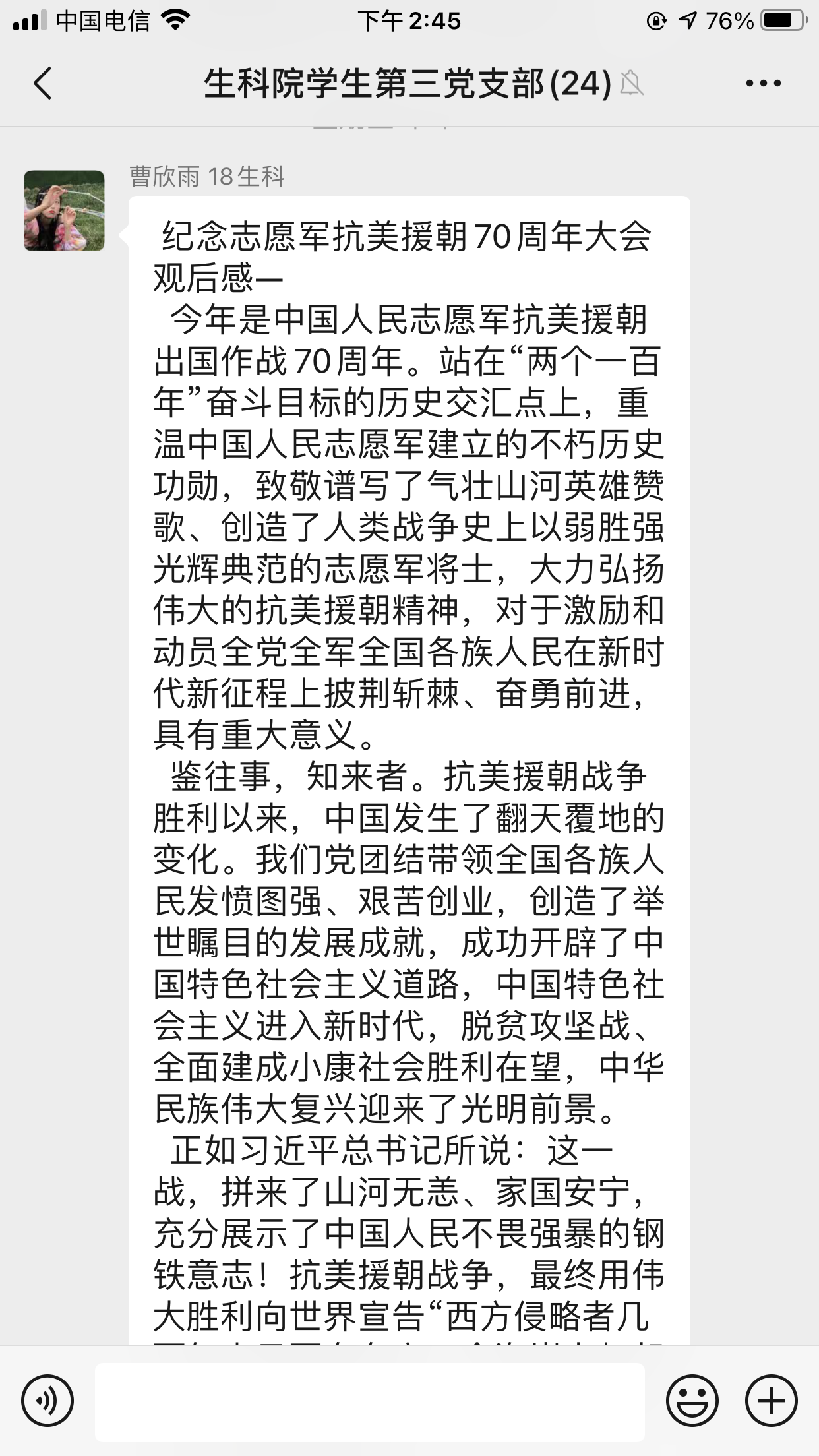 本网讯 10月23日上午,生命科学学院学生第三党支部全体党员通过电视、网络、学习强国等媒体平台,收看“纪念中国人民志愿军抗美援朝出国作战70周年大会”直播,认真学习习近平总书记在纪念中国人民志愿军抗美援朝出国作战70周年大会上的重要讲话精神。
