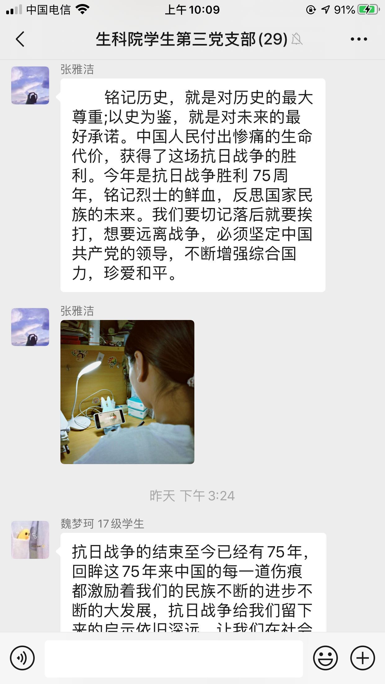 抗战胜利75周年,这不仅仅是纪念日,更是一段刻骨铭心的岁月,是中国人民强大精神力量的最好证明。山河无恙,致敬英雄。此次的学习,激发了支部党员的爱国情、强国志。他们表示,在今后的学习和工作中,将继续不忘初心、牢记使命,铭记历史、开创未来。(生命科学学院:李万成)