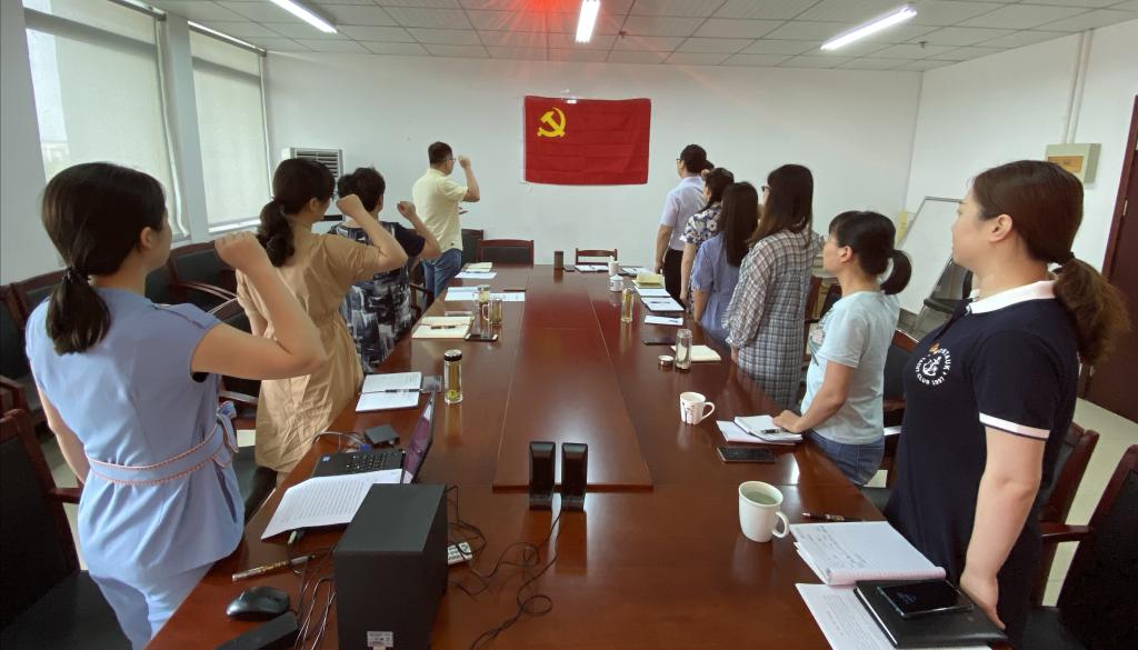 首先,全体党员重温入党誓词。在支部书记刁文彬的带领下,全体党员举起右拳,面对鲜红的党旗,郑重宣誓,表达了不忘初心跟党走,为学院建设发展和学生健康成长而不懈奋斗的决心。