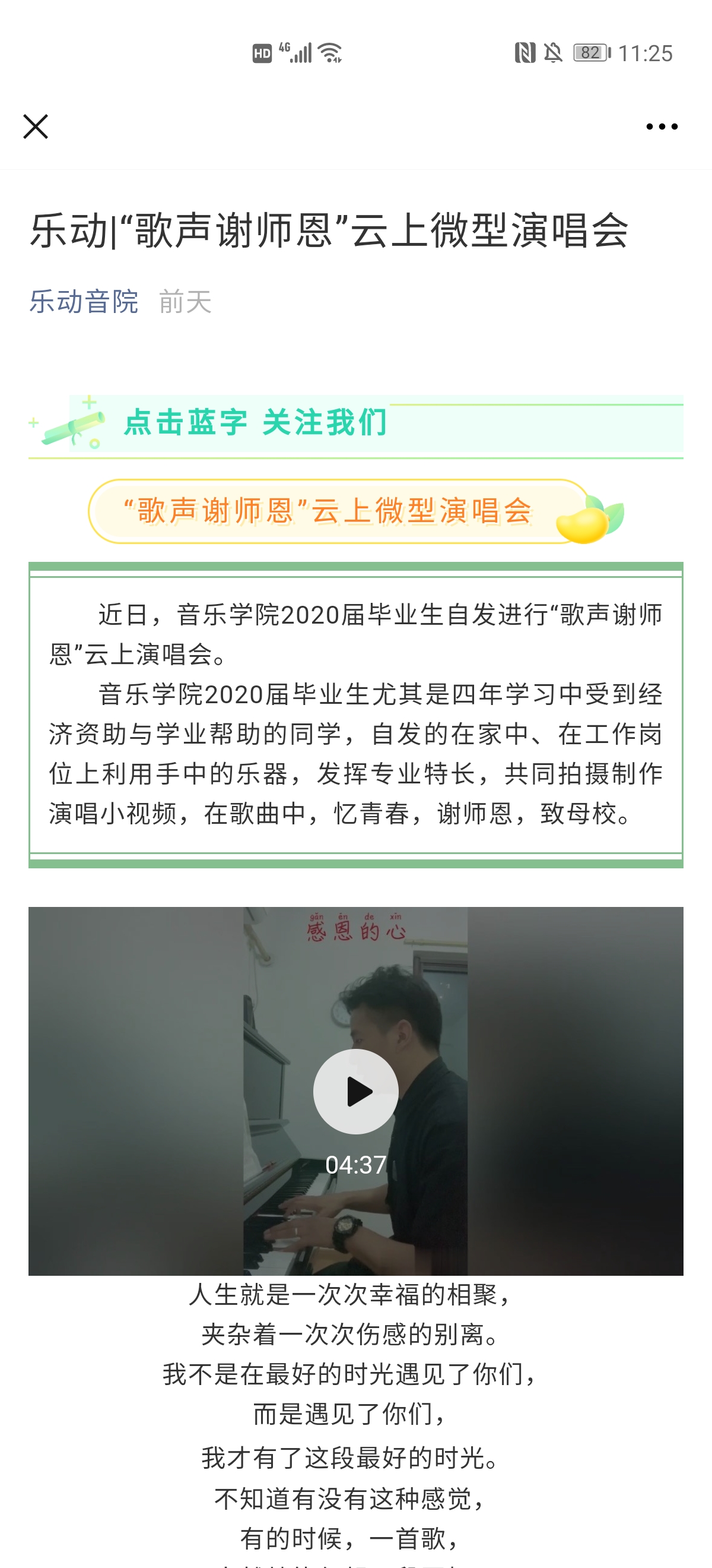 音乐学院2020届毕业生尤其是四年学习中受到经济资助与学业帮助的同学,自发在家中、在工作岗位上利用手中的乐器,发挥专业特长,共同拍摄制作演唱小视频举行“歌声谢师恩”云上微型演唱会,分享到音乐学院公众号,在歌曲中,忆青春,谢师恩,致母校。