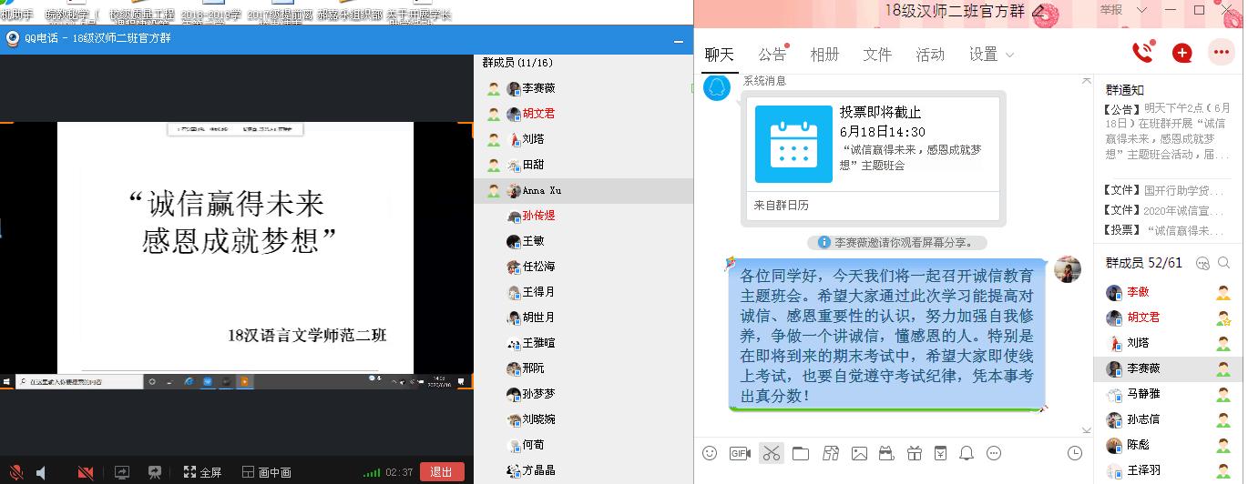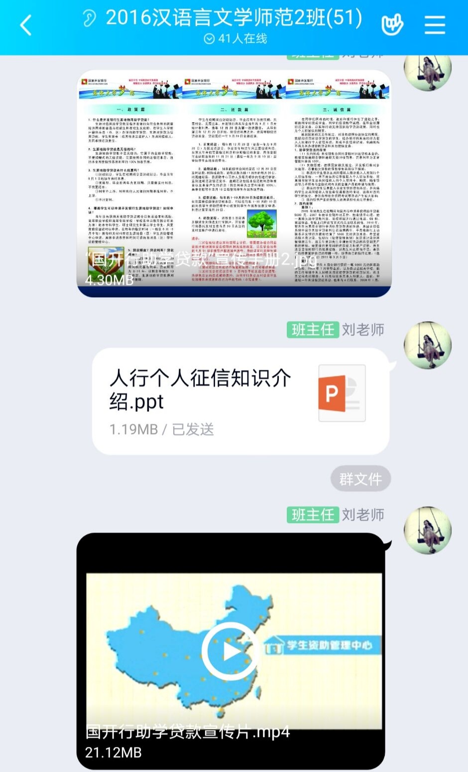 一是举办线上主题班会。各年级辅导员通过QQ群和学习通等形式开展资助诚信主题班会,帮助大学生树立诚信意识,提高学生对诚信重要性的认识;通过宣传诚信、励志、感恩的道德准则,教育和引导同学们树立正确的受助感恩观念,培养同学们强烈的社会责任感和自立自强的优秀品质,并将助学贷款宣传片、宣传手册PPT发放给学生观看,让同学了解国家资助政策,以及党和政府的庄严承诺“不让一个学生因家庭经济困难而失学”。