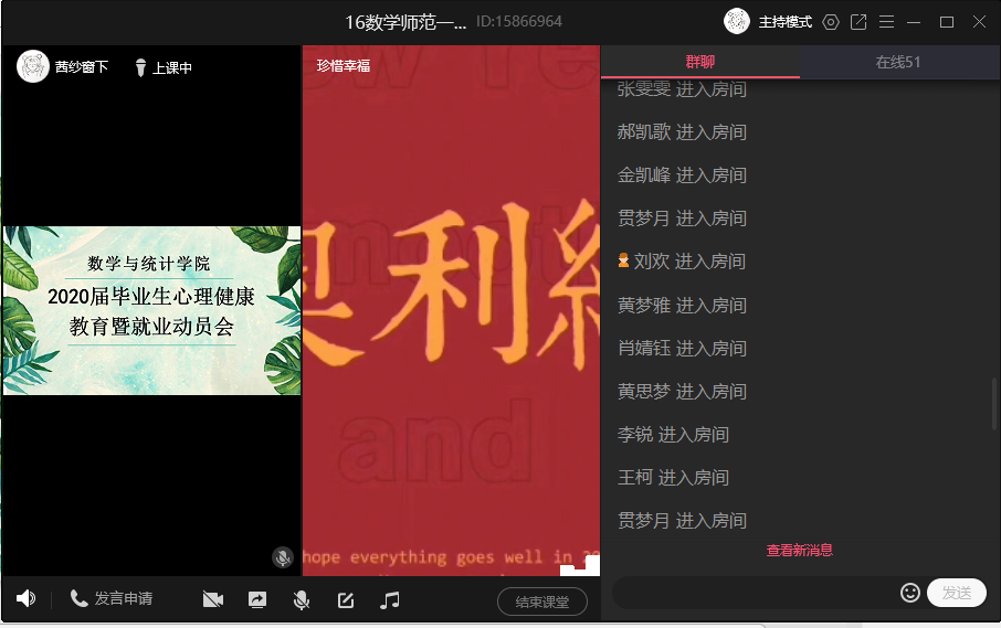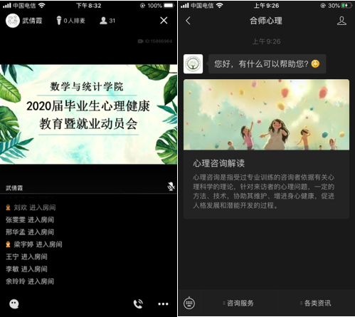 本网讯 由于新型冠状病毒肺炎疫情的影响,本应返校忙碌于毕业、升学、就业等事宜的2020届毕业生大部分仍在家无法正常求职学习。面对众多事宜给毕业生们带来的困扰与压力,数学与统计学院组织毕业班辅导员于5月19日在线上开展了“2020届毕业生心理健康教育暨就业指导会“,2016级全体学生参与。