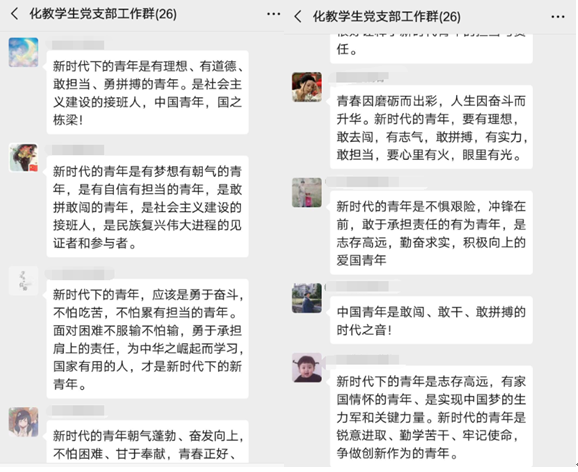 本网讯 5月4日,为强化新时代高校青年学生爱国主义教育和青年大学生责任与担当意识,化学教育系学生党支部组织学生党员学习习近平总书记五四寄语精神,并对新时代青年寄语谈学习认识。