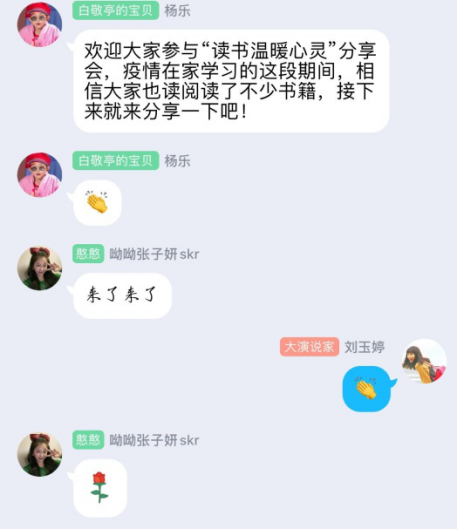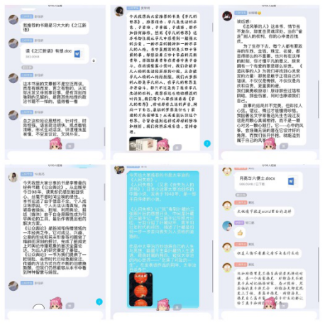 本次云读书分享活动采用小组分享的形式,五位同学为一组,将班级划分为十个小组,选取代表进行读书分享。分享的主题主要围绕同学们在疫情期间的阅读、学习以及所见所感。随着活动的展开,各小组代表将自己阅读的书籍和心得体会利用word、ppt等形式向班级同学分享,同学们积极发言,各抒己见,营造出了良好的学习氛围。