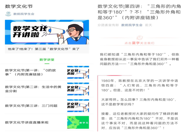 此次活动包括数学文化宣讲、线上趣味竞赛和在线专题讲座三个部分。学院在数统院官方微信公众号中开展“数学文化开讲啦”系列宣讲,介绍了“0”的故事、生活中的黄金分割、三门问题、三角形的内角与外角和等极具趣味性的数学小知识;通过开展线上趣味竞赛,加强了学生对此次文化节的参与性和互动性。同时,此次文化节邀请了数学与统计学院副教授、全国优秀教师黄浩以网络直播的形式开展了“数学无处不在”的线上主题讲座。该讲座集专业性和趣味性于一体,通过讲述数学的发展史、数学的作用、如何学好数学等内容带领学生们进行了一场精彩的数学文化之旅,并且结合此次新冠肺炎疫情,讲述疫情中数学建模的重要作用,激发学生对数学学习的兴趣和社会责任感。该讲座在线参与学生数近300人次,深受广大师生好评。