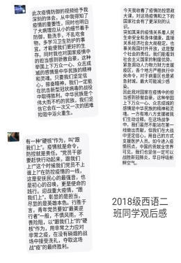 通过这堂“疫情防控思政大课”,促进了我院学子深入学习了党中央在应对疫情时正确的决策部署和全国人民众志成城的抗疫壮举,真切领悟到了中国共产党领导和中国特色社会主义制度的显著优势,更是被一线抗疫故事深深地感动着。真实的疫情,特殊的学期,已然的变化,需迎的挑战。一切都在磨砺和锻炼着青年一代,不忘初心,牢记使命,打赢疫情防控阻击战,坚信春风定会吹向每一个角落!(外国语学院:苏珊、江洋、周贵勤)